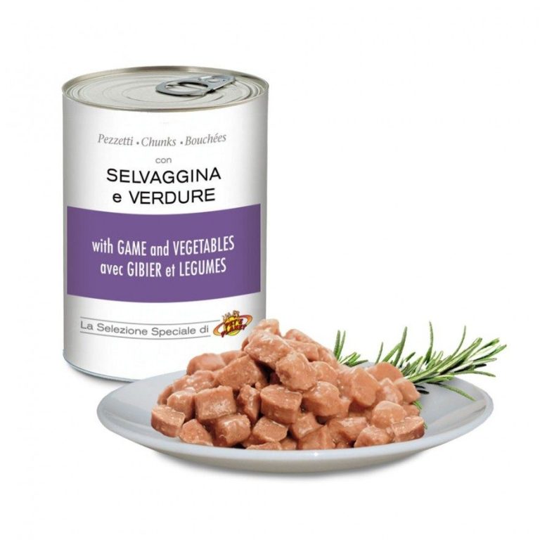 Composition : Viandes et sous-produits animaux (viandes « entiers » par conséquent, les dérivés correspondants : foie, cœur, tripes, poumons, ailes et cous, etc. gibier 8%), légumes 4,2%, céréales (inséré sous forme entière), œufs et produits d’œufs, substances minérales. Additifs : Additifs nutritionnels : Vitamine A 1200 UI/kg, Vitamine D3 160 UI/kg, Vitamine E 3,5 mg/kg. Additifs technologiques : épaississants et gélifiants.